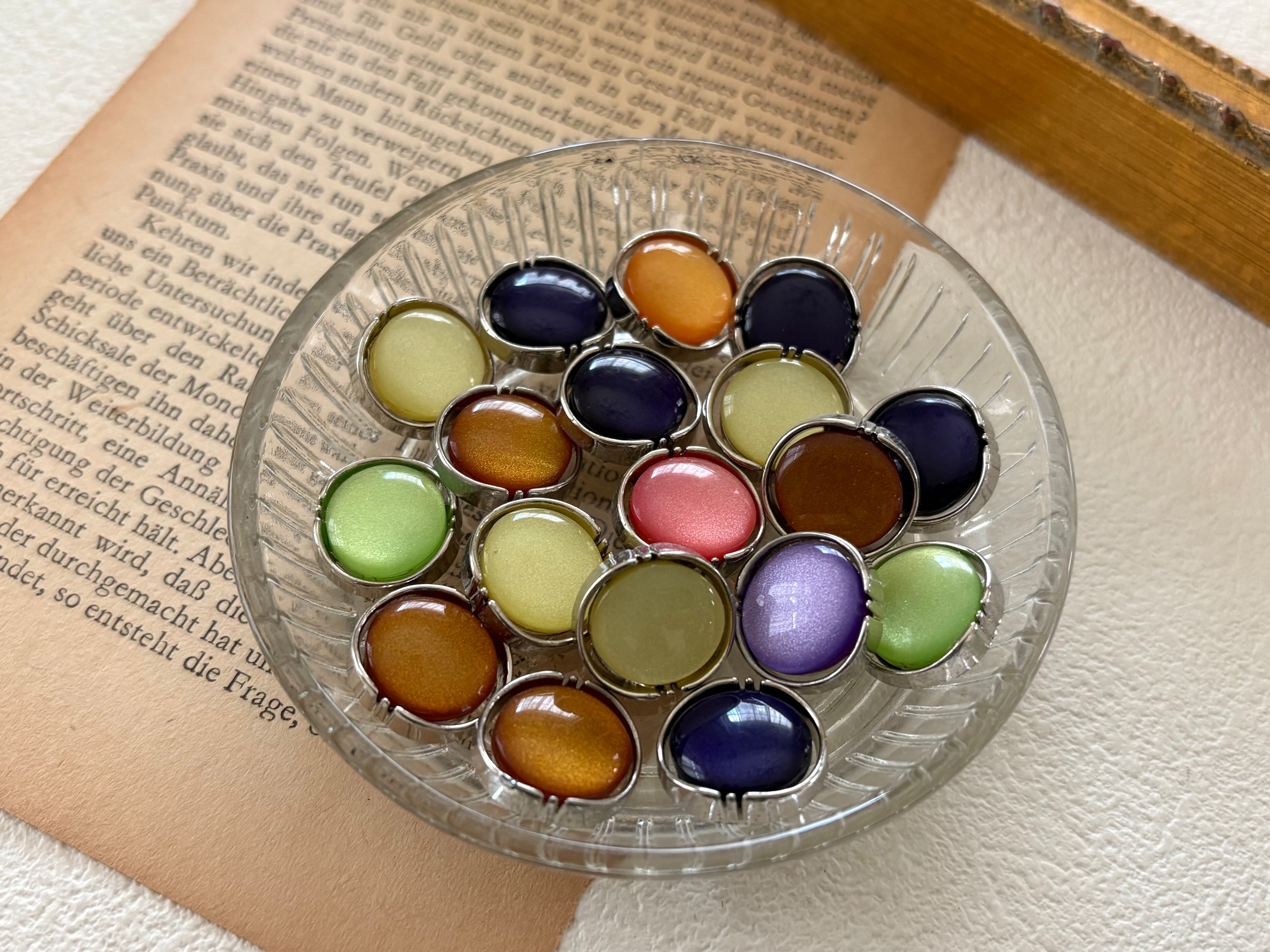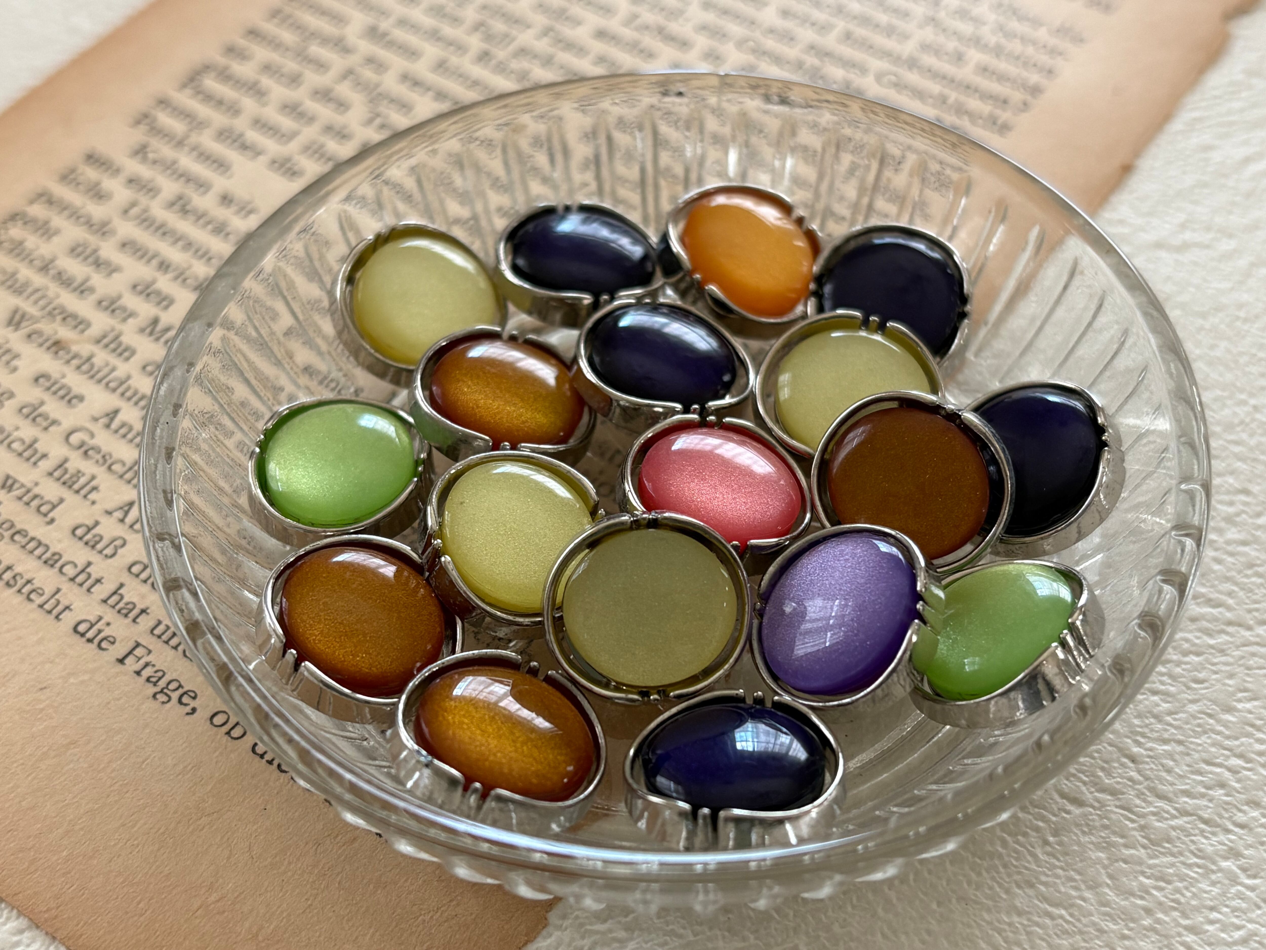 飾りボタンには勿論のことアクセサリーパーツとして、カルトナージュのデコレーション材になど様々な用途でお役立て下さいませ。