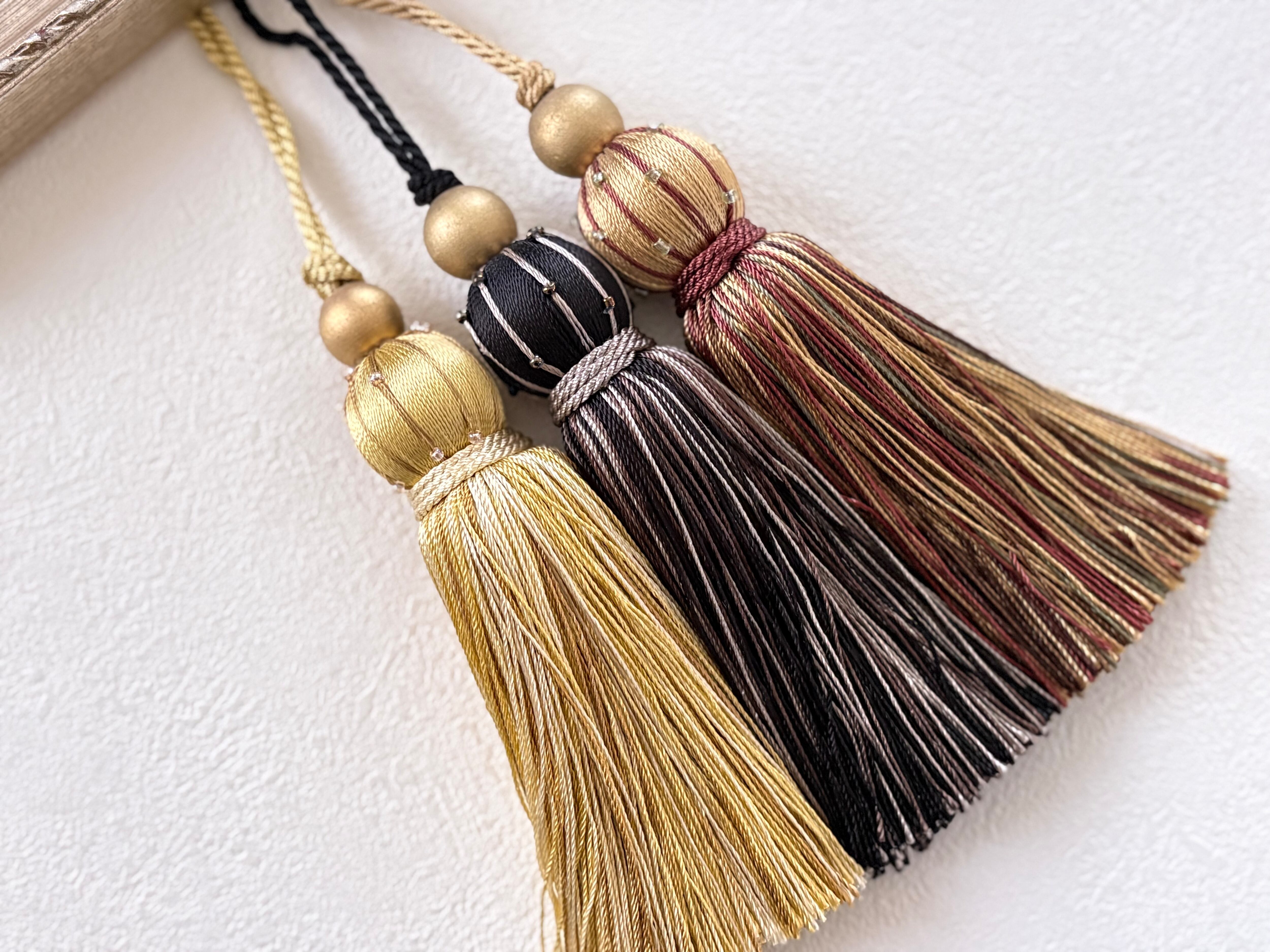 大きめなサイズ感とトップのビーズ、巻玉の装飾、艶やかで上質なタッセルです。