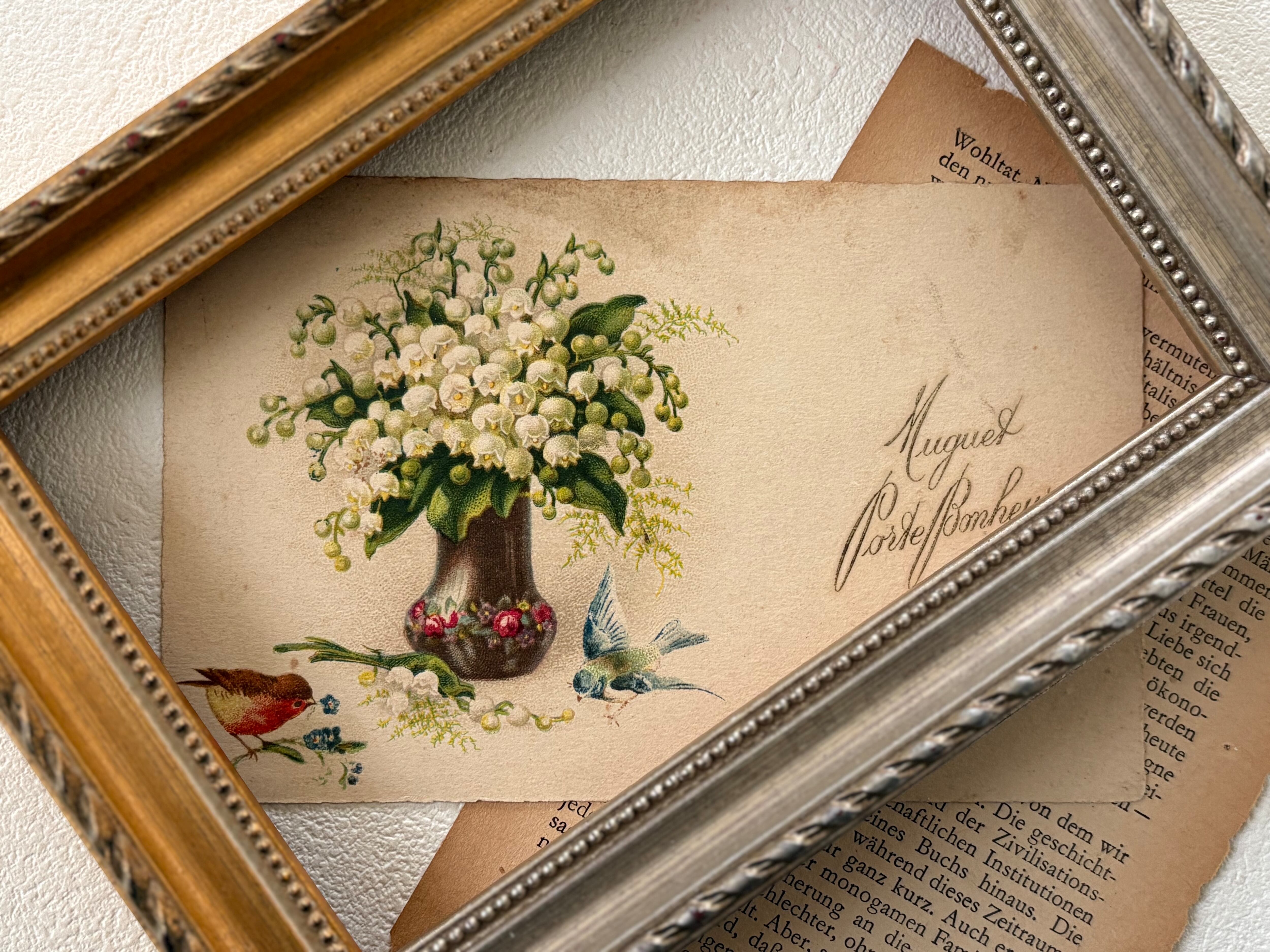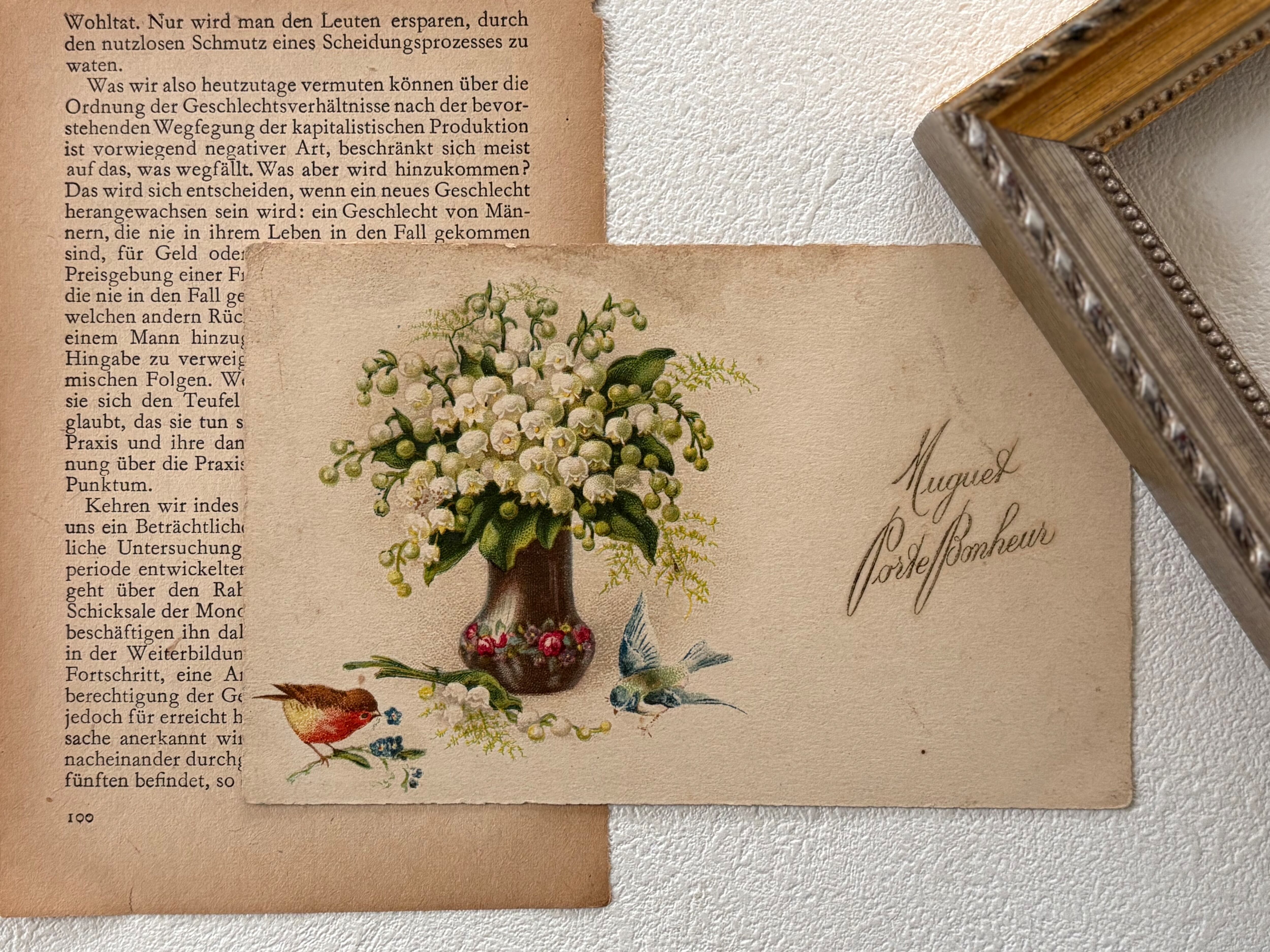 フランス アンティークカード porte-bonheur(ポルト-ボヌール) Muget すずらんと小鳥 1929年 額装 インテリア