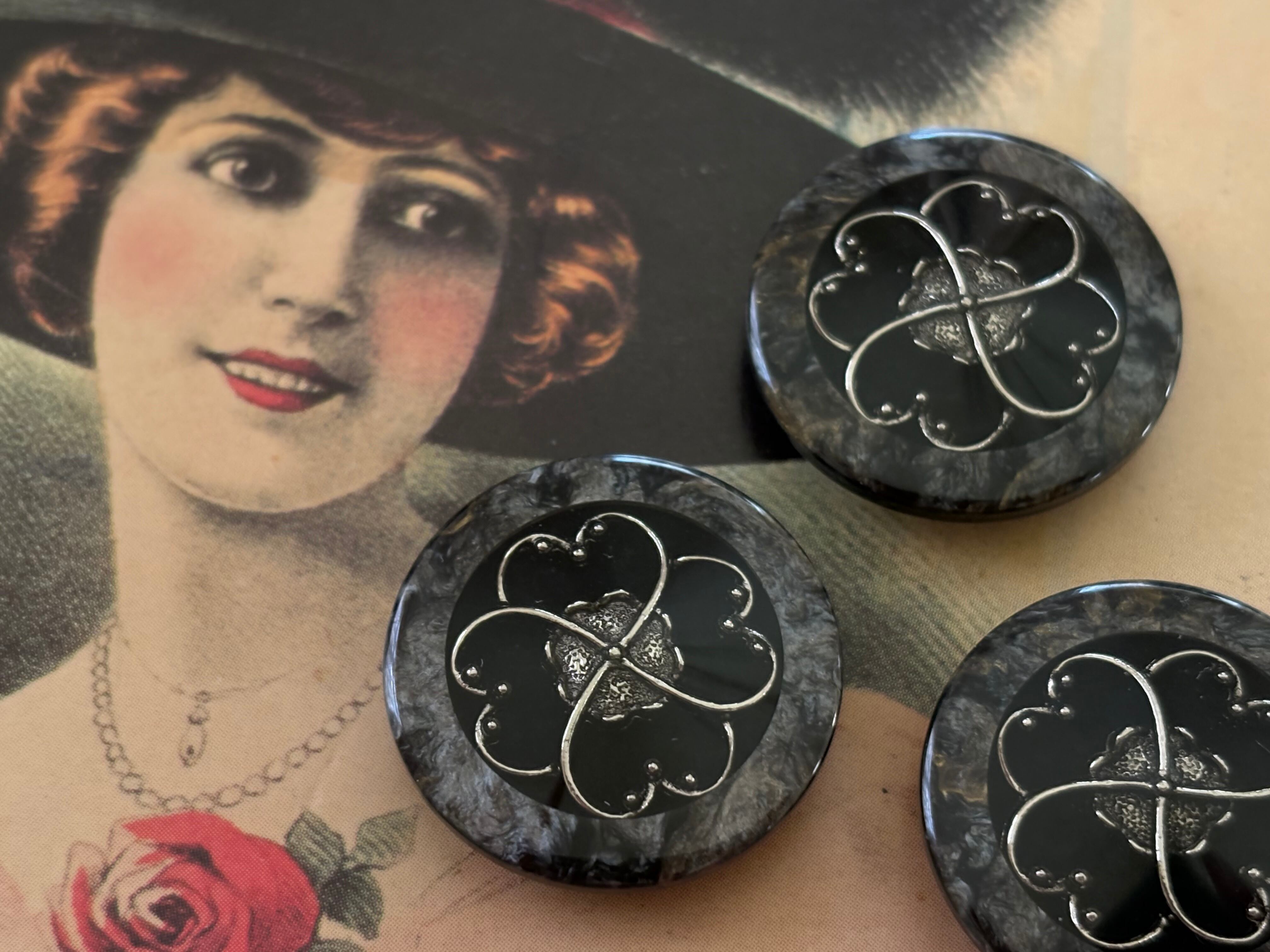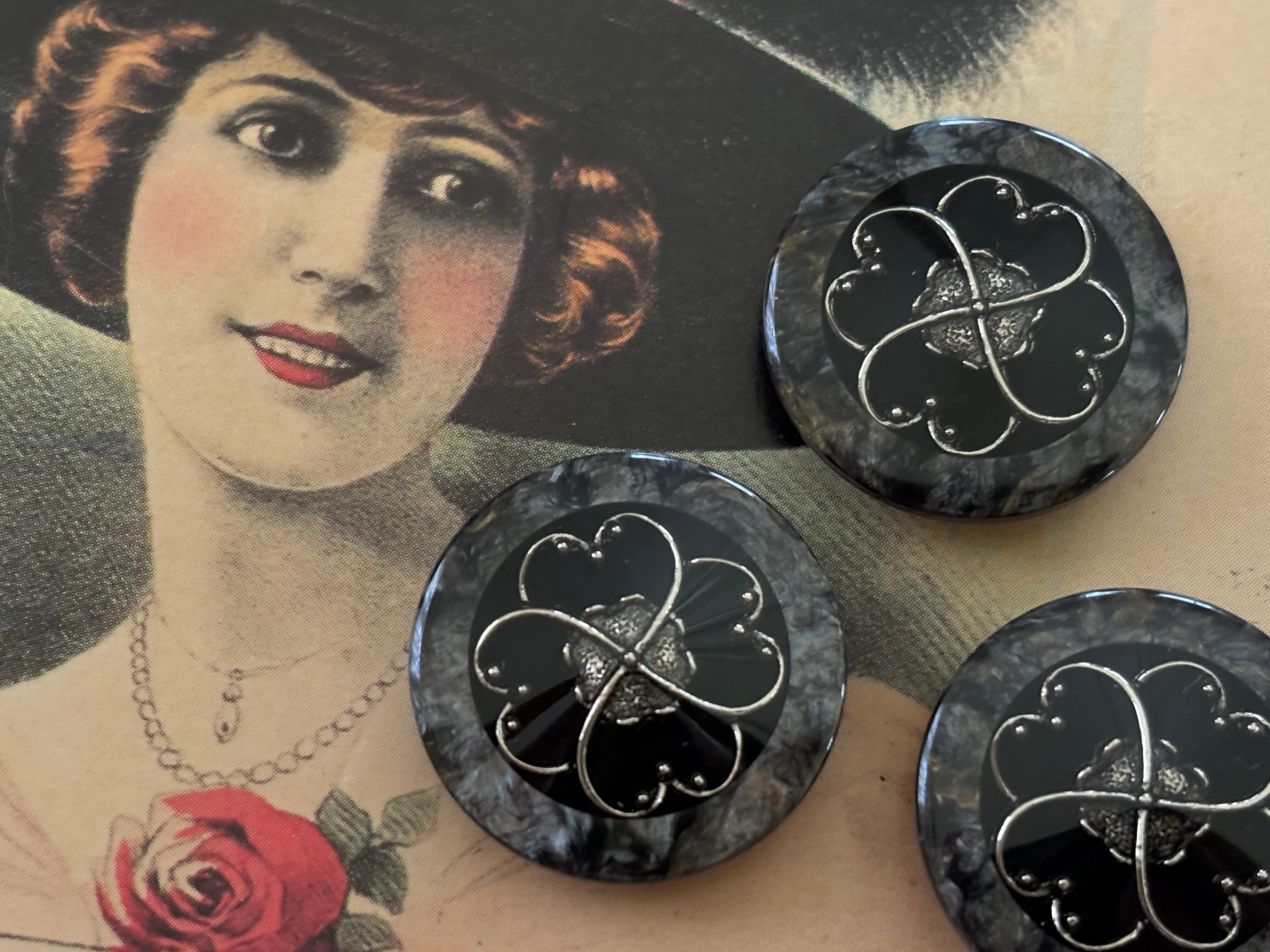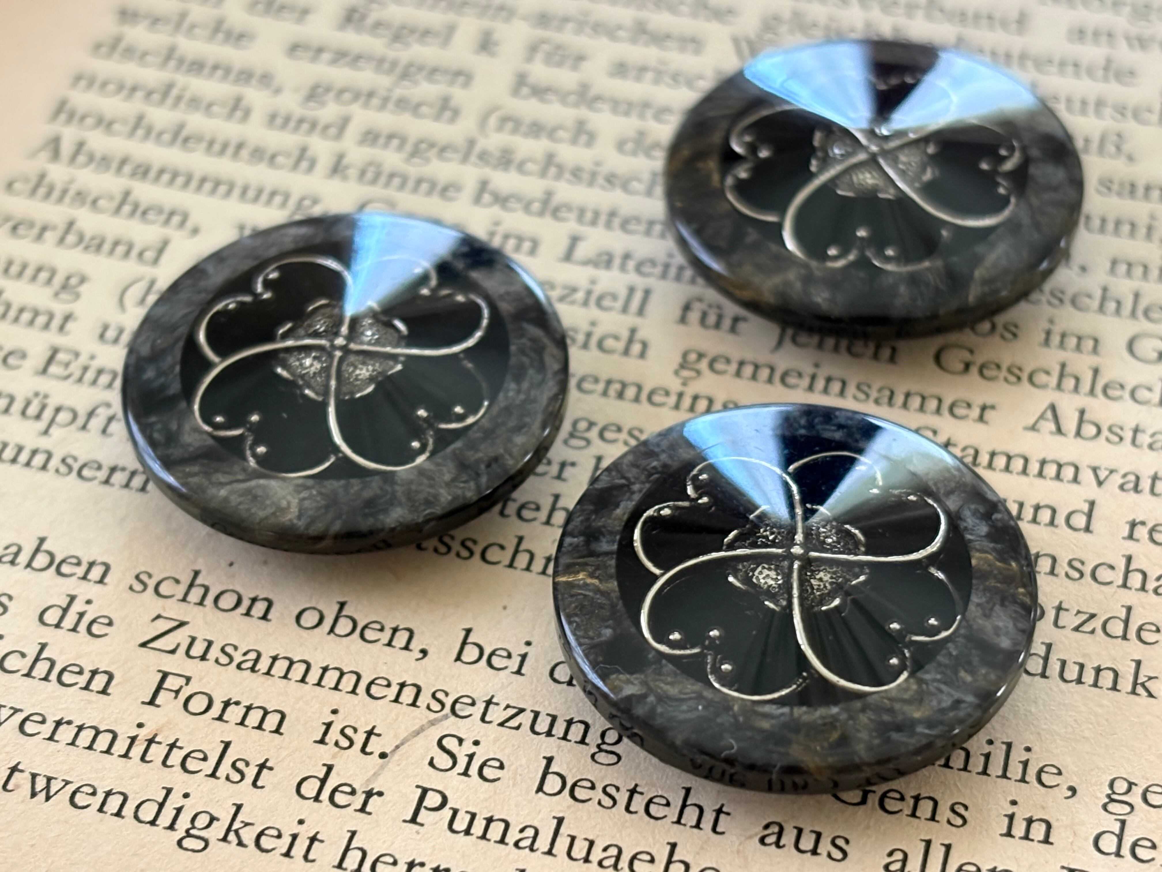 24mm Japanese ヴィンテージボタン マーブル調 グレー×シルバー フラワー アクセサリーパーツ 装飾材