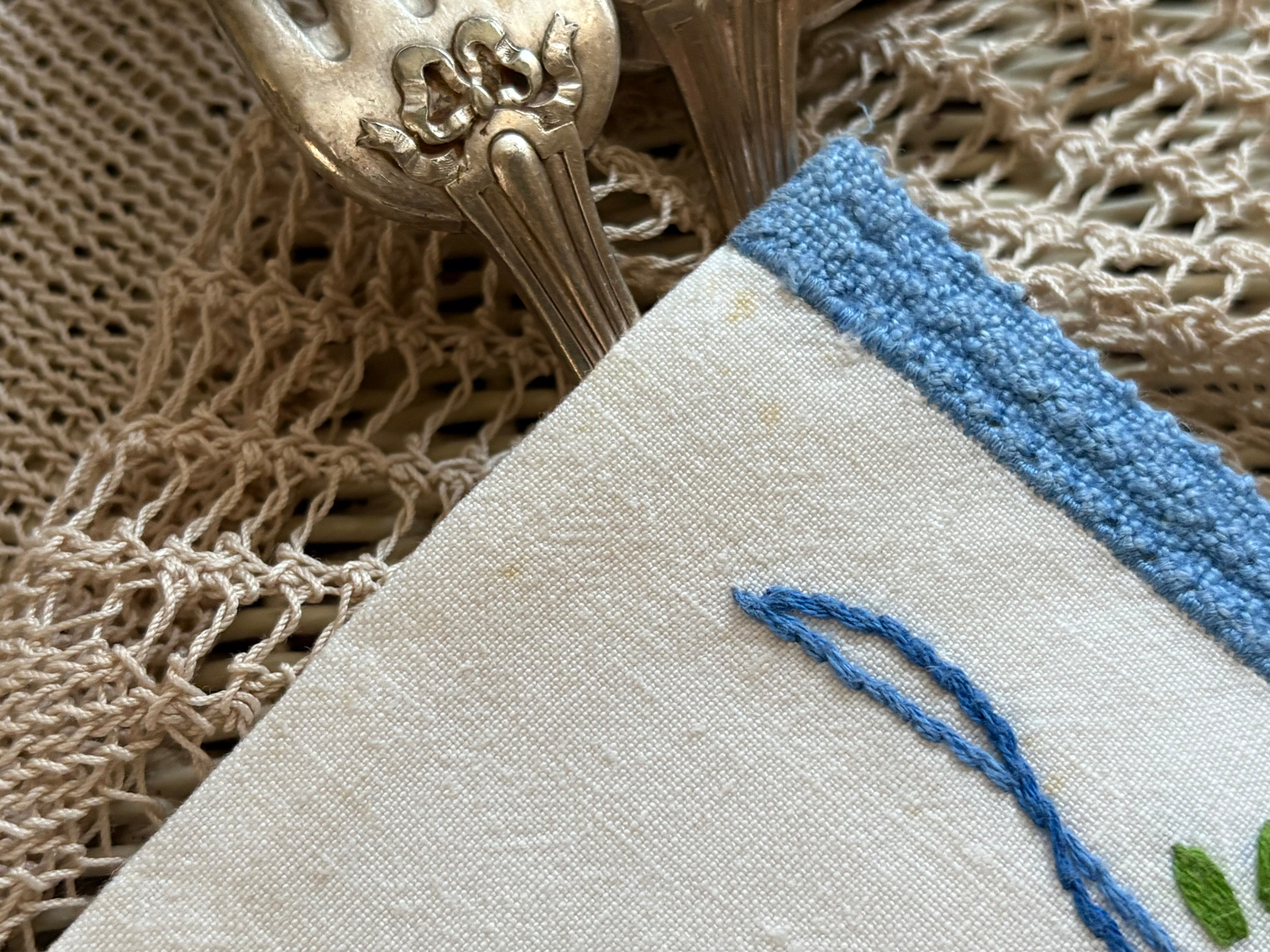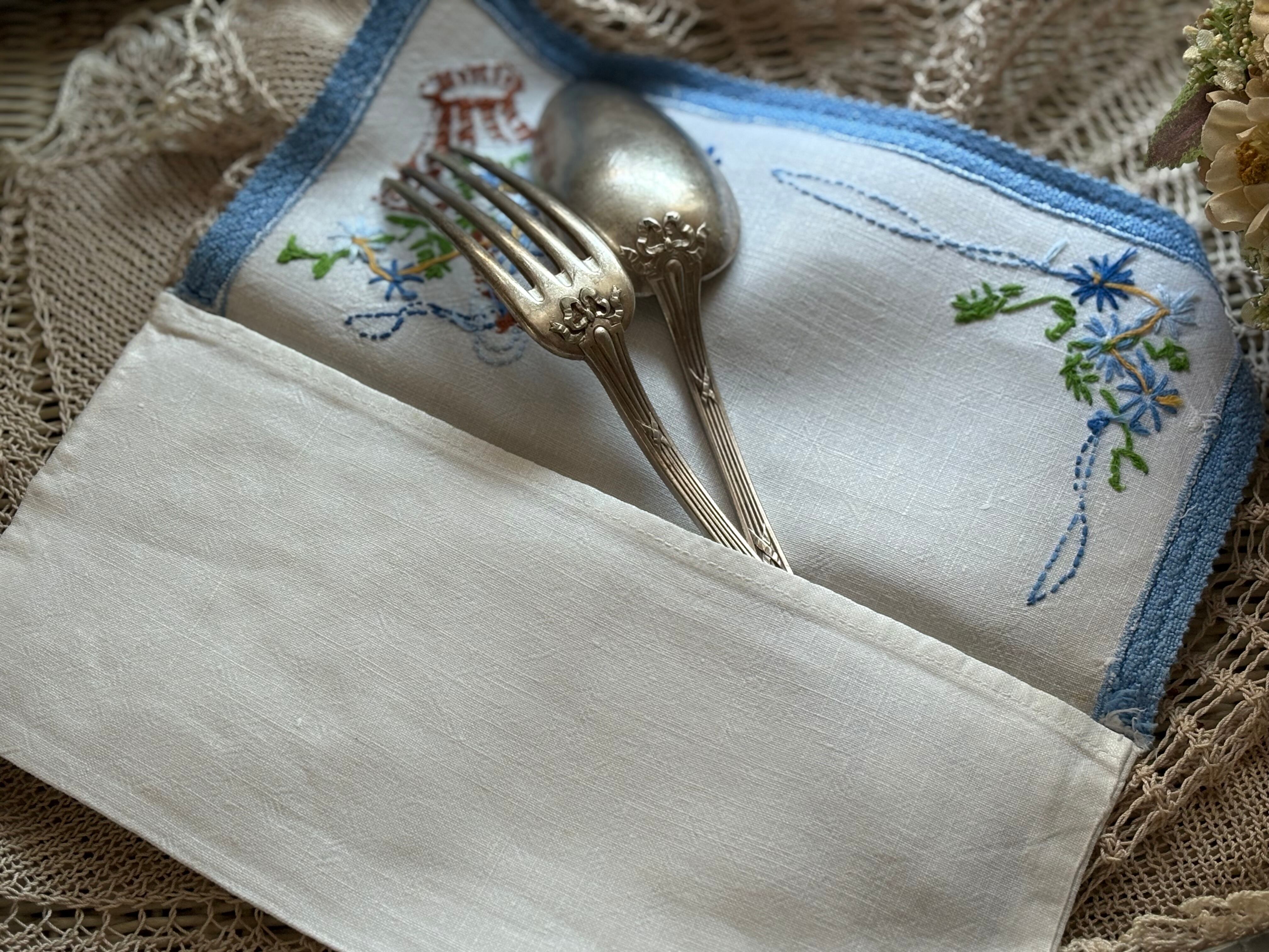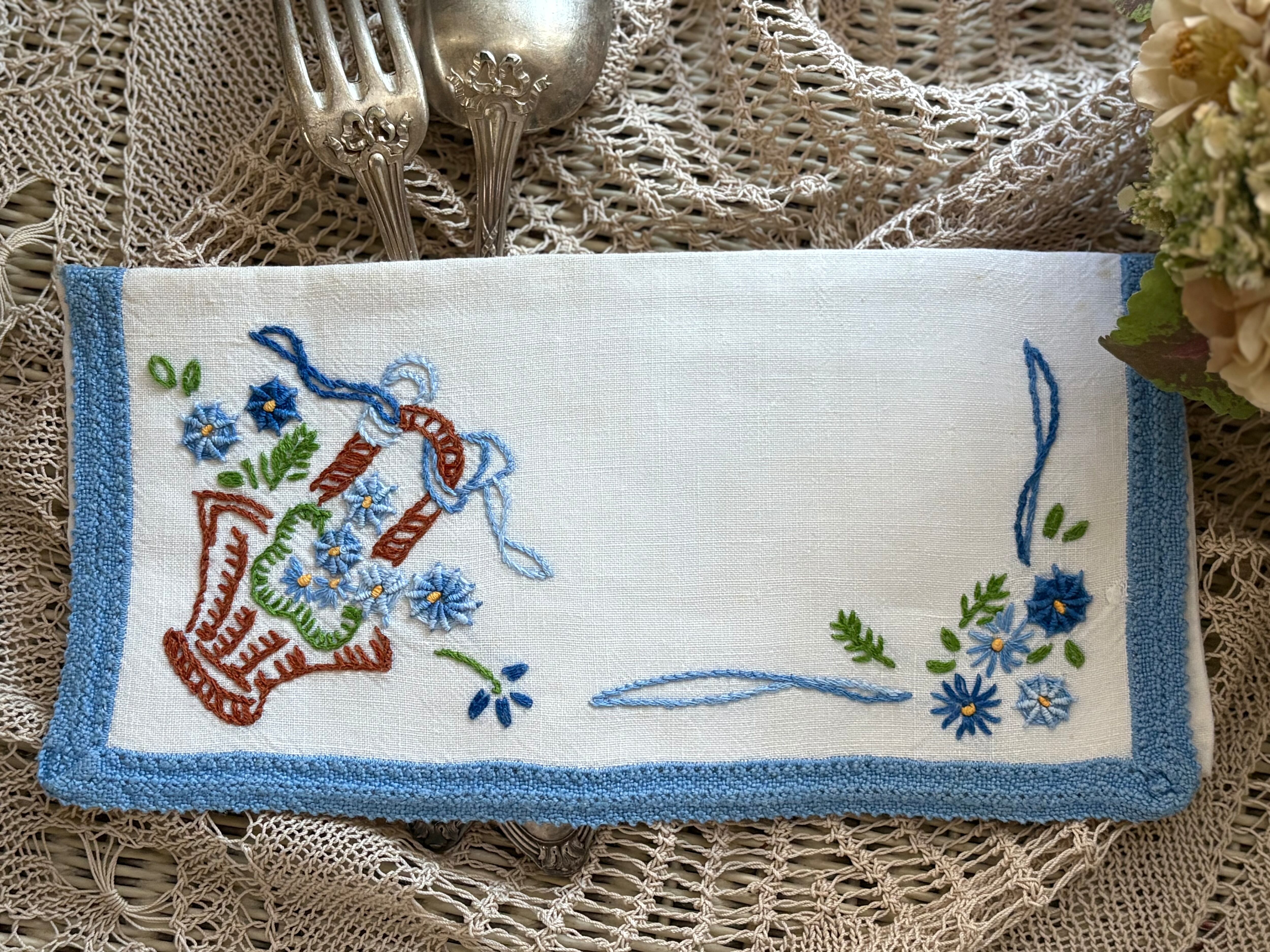 フランスVintagete カトラリーケース 手刺繍のパニエ 花柄 花籠 ライトブルー ハンドメイド素材 ポーチ 撮影小物