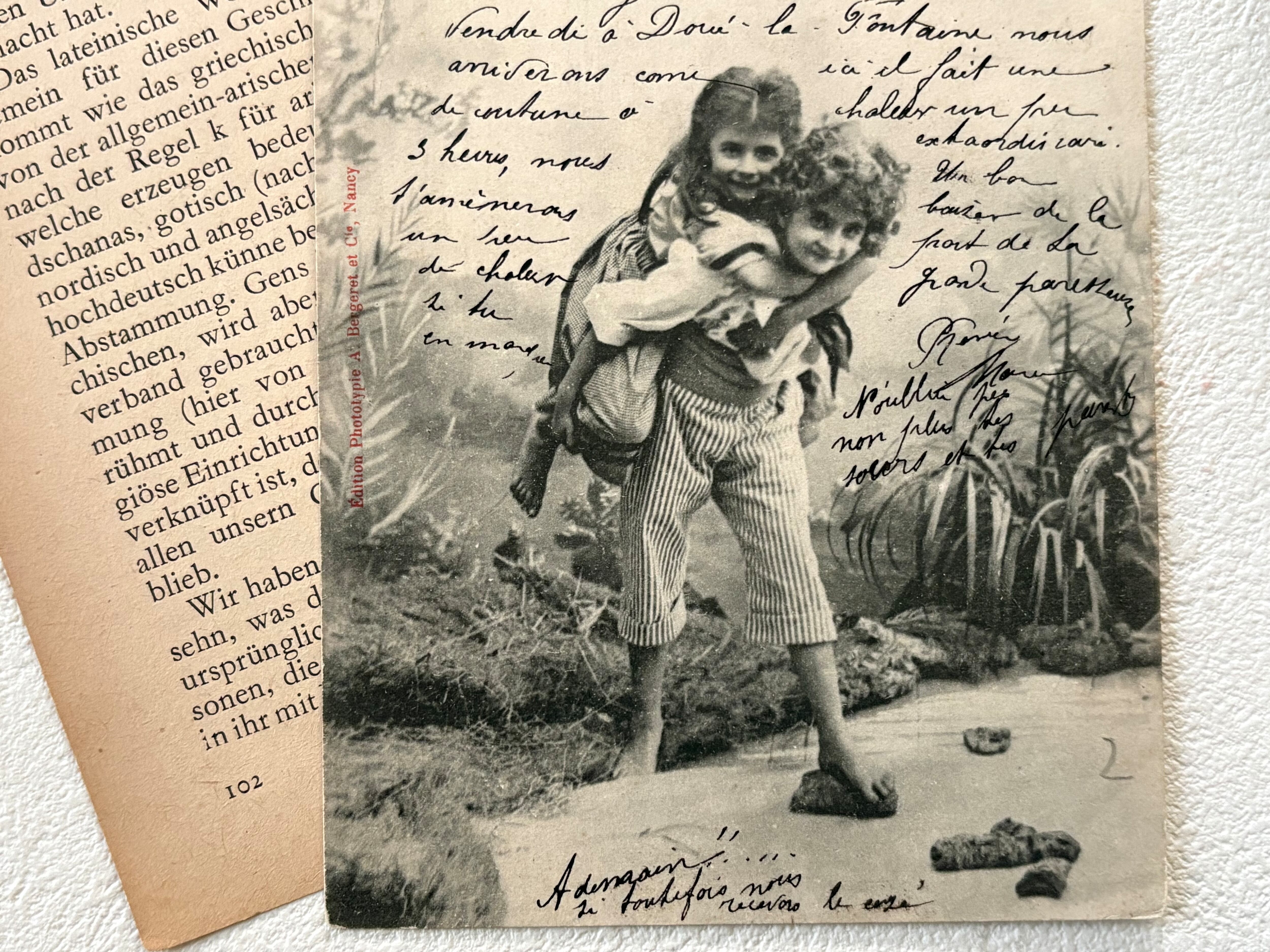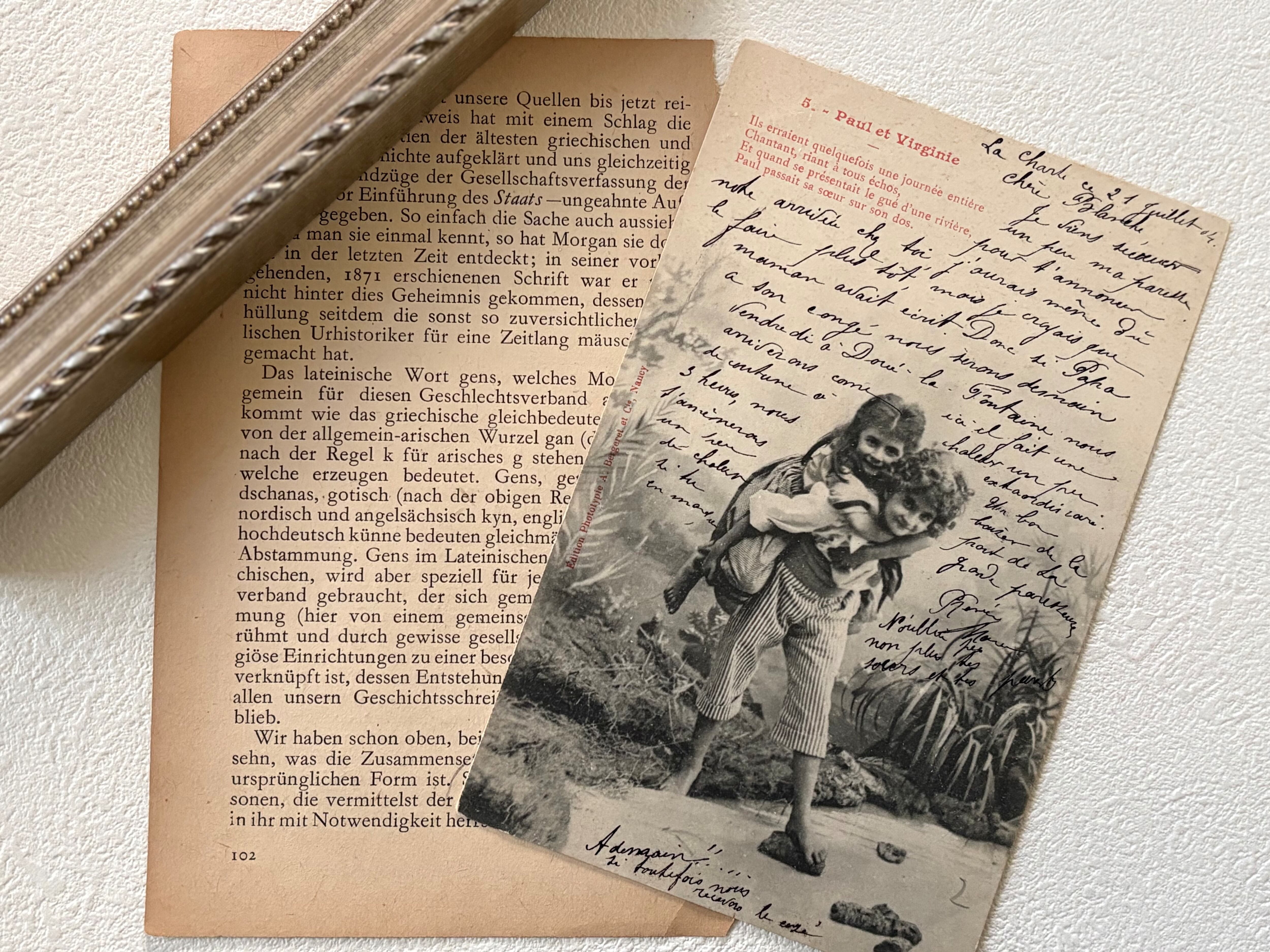 アンティークポストカード 小川を渡る兄妹 1904年 セピアカラー 額装 コレクション フランス