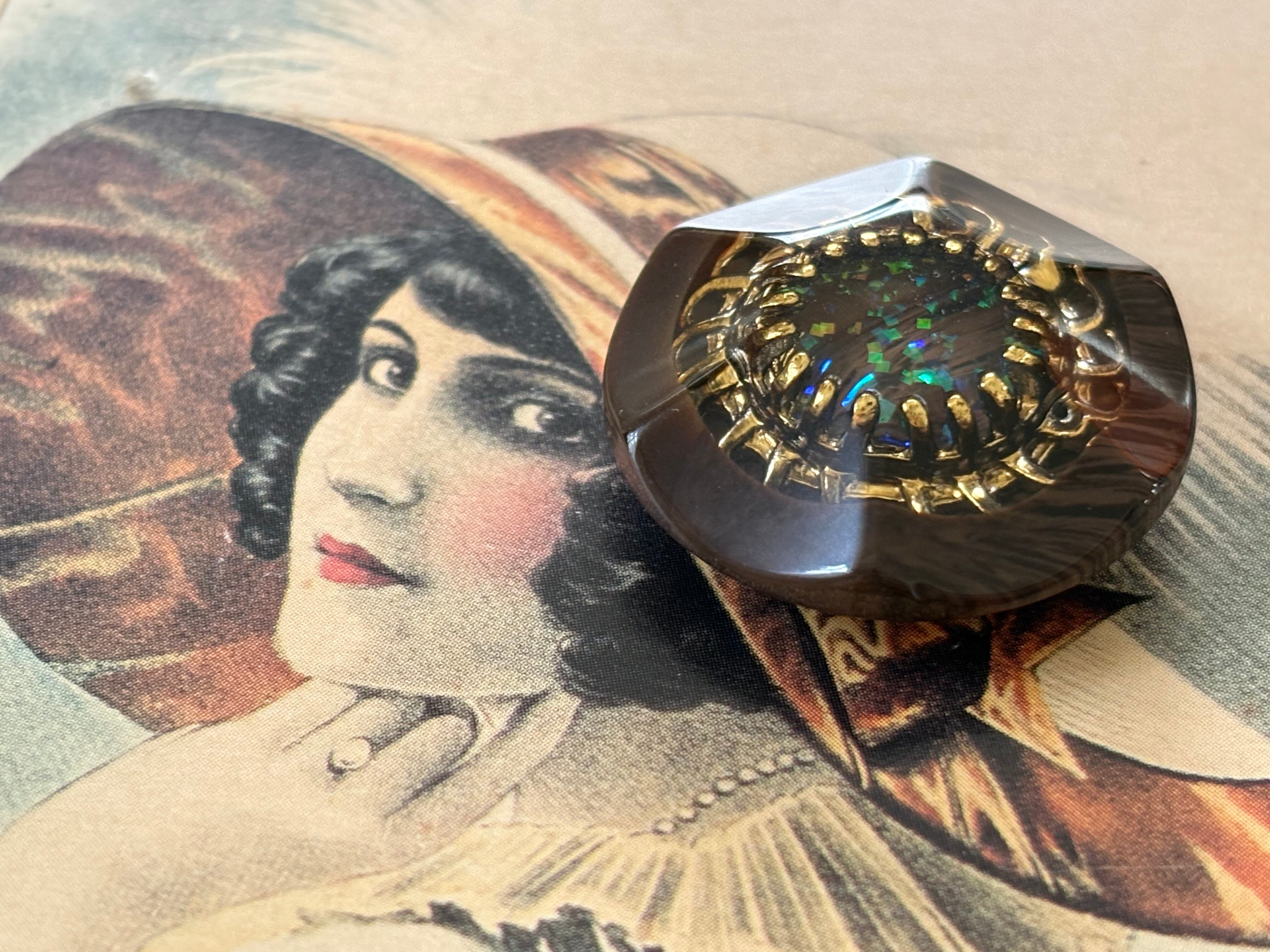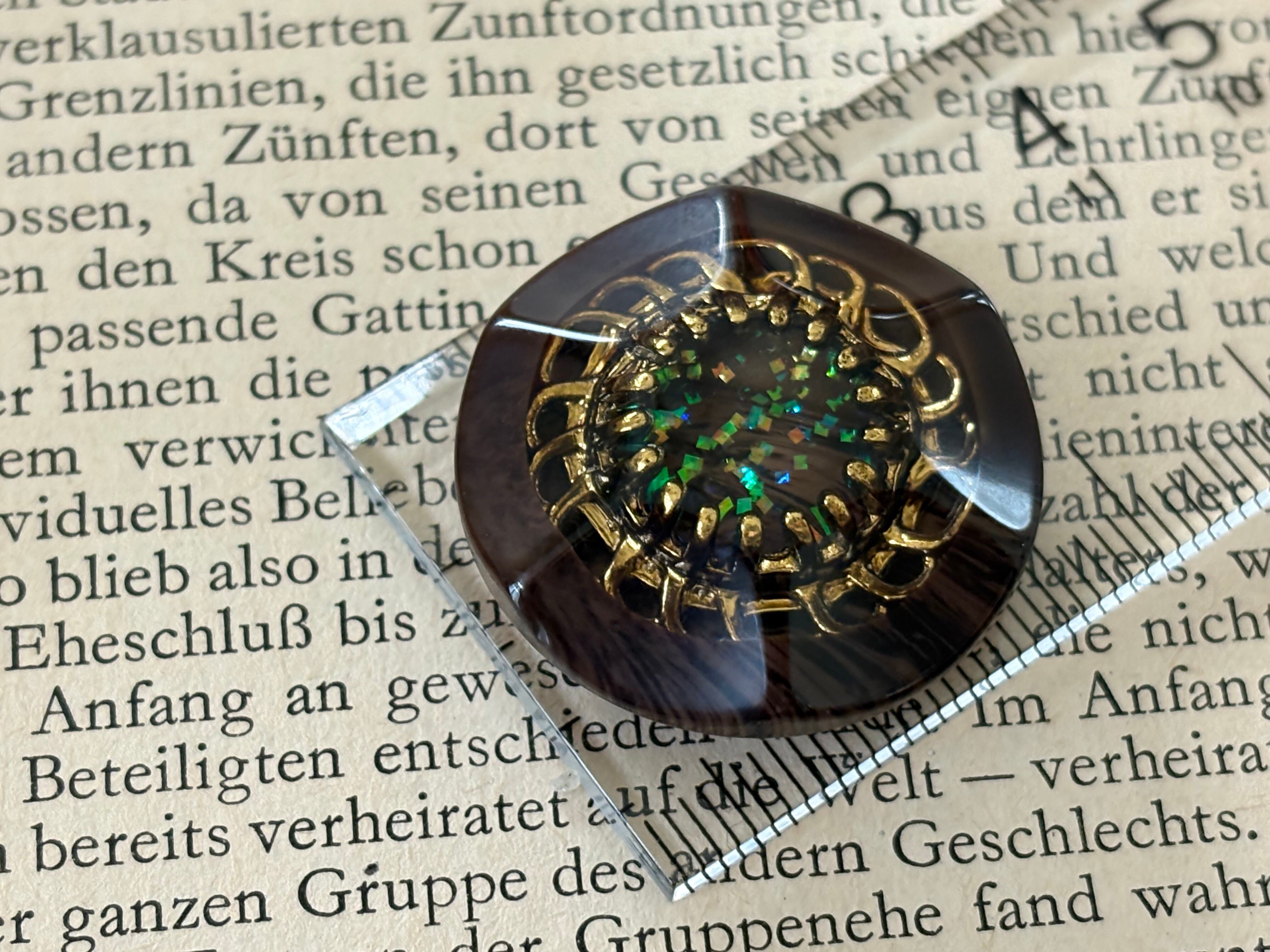 シックなブラウンの樹脂ボタンの内側にクラシカルでゴージャスなゴールドのパーツが埋め込まれています。パーツの内側にはオーロラに輝くグリッター。