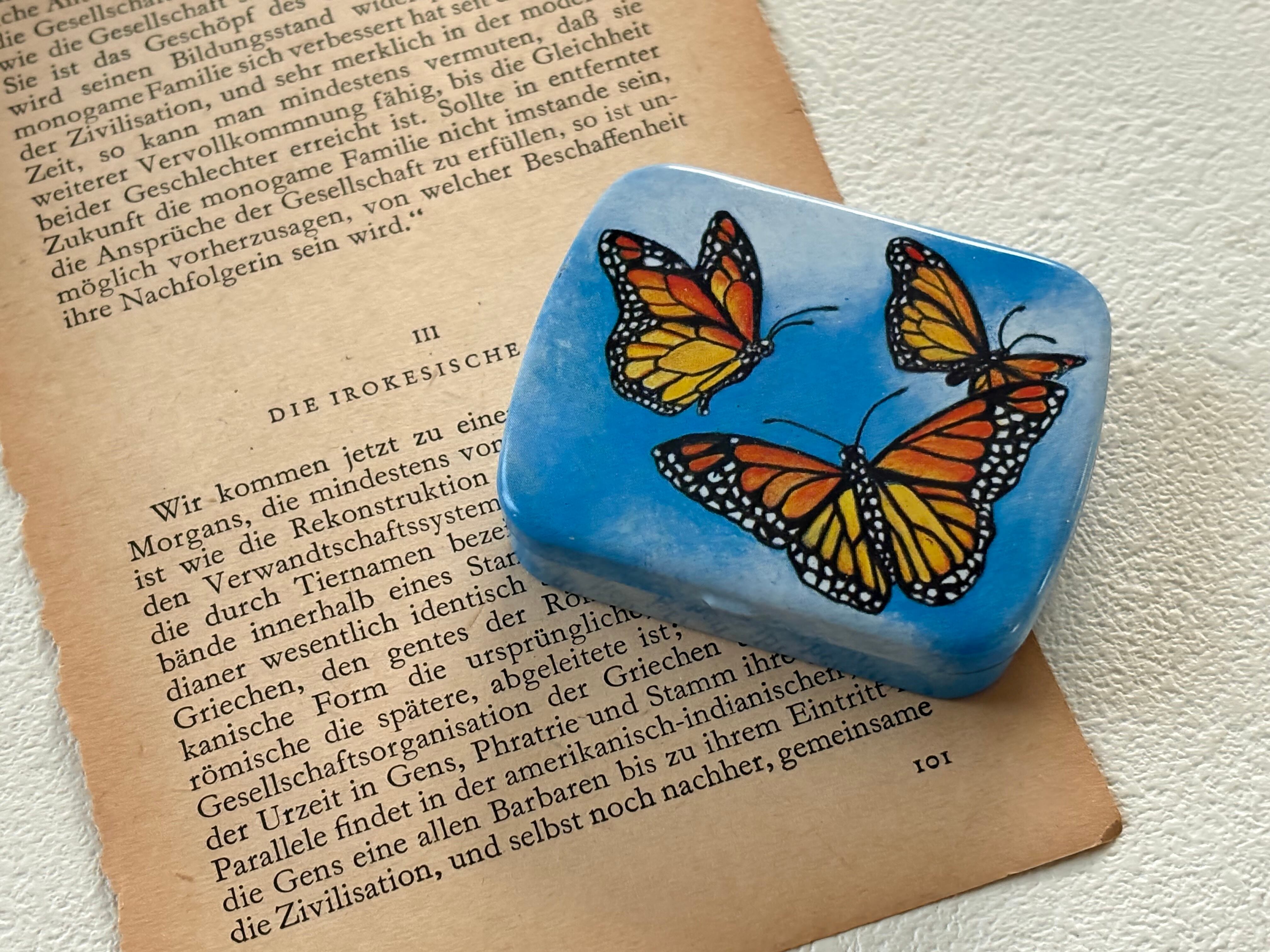 空に舞うパピヨン(蝶々)のデザインの小さなTin缶です。