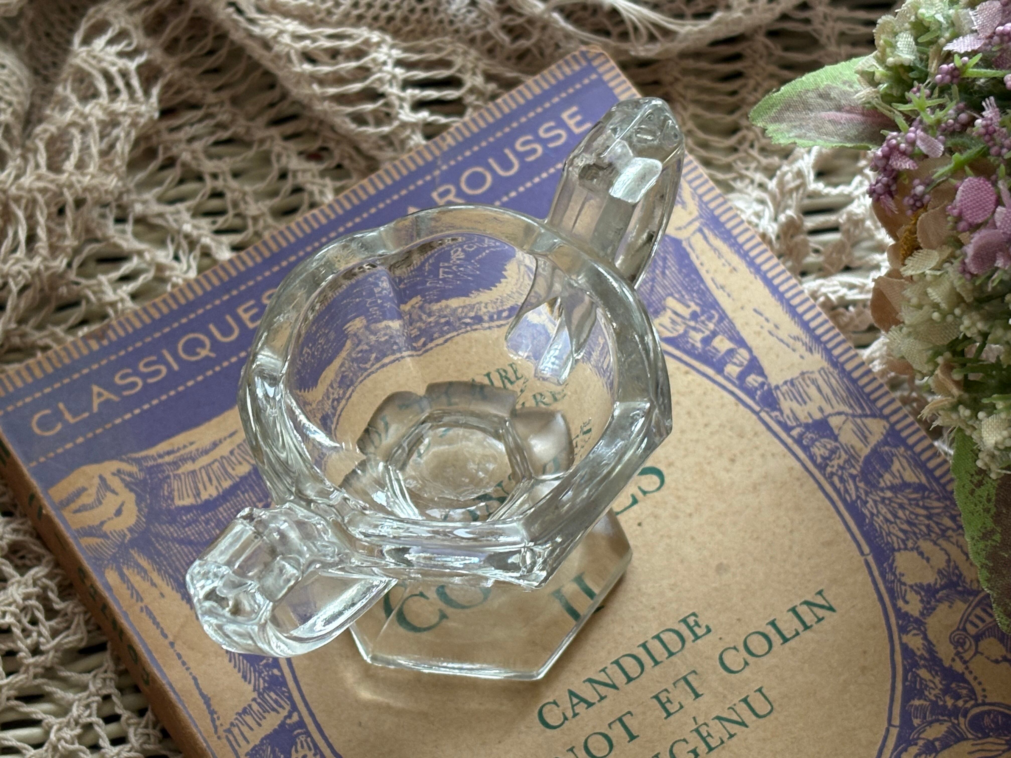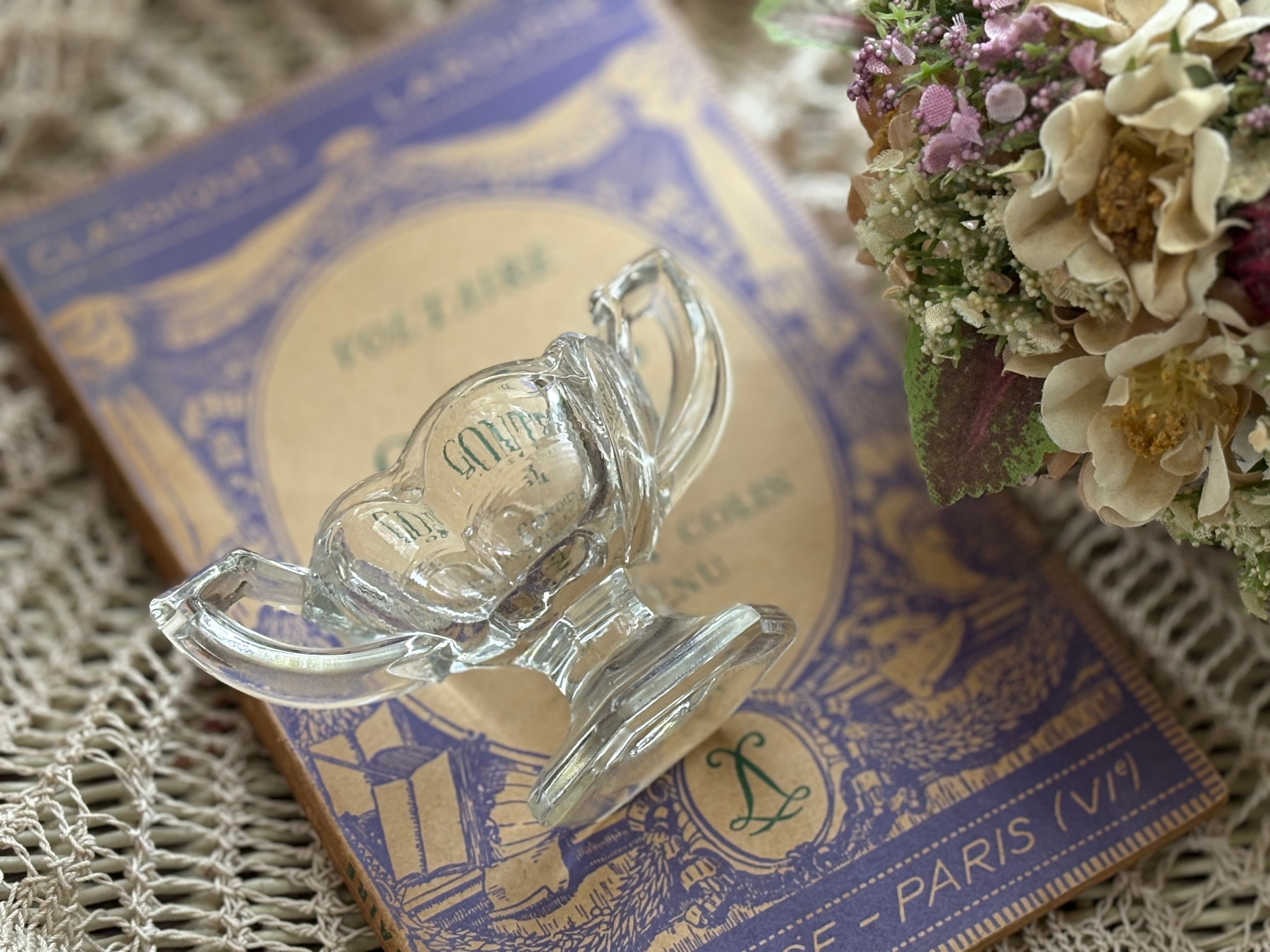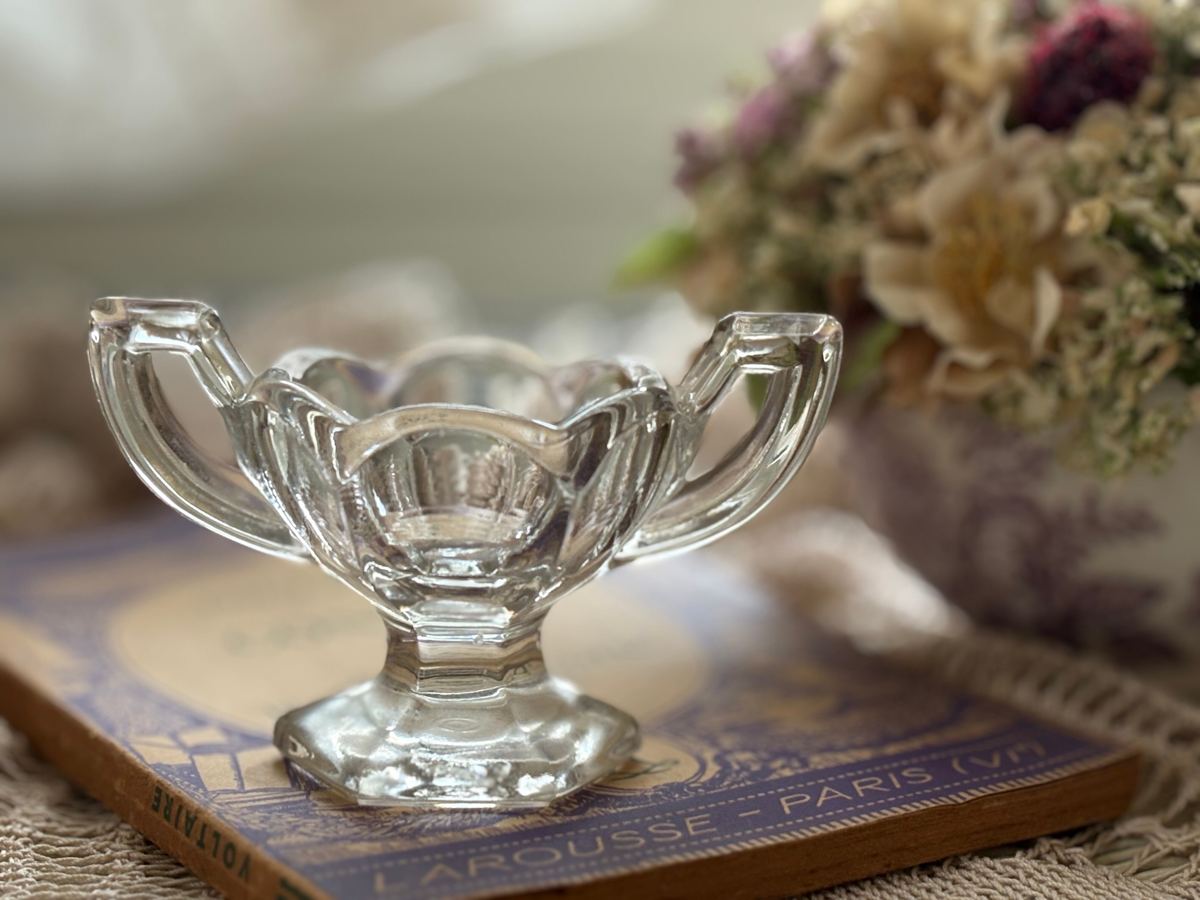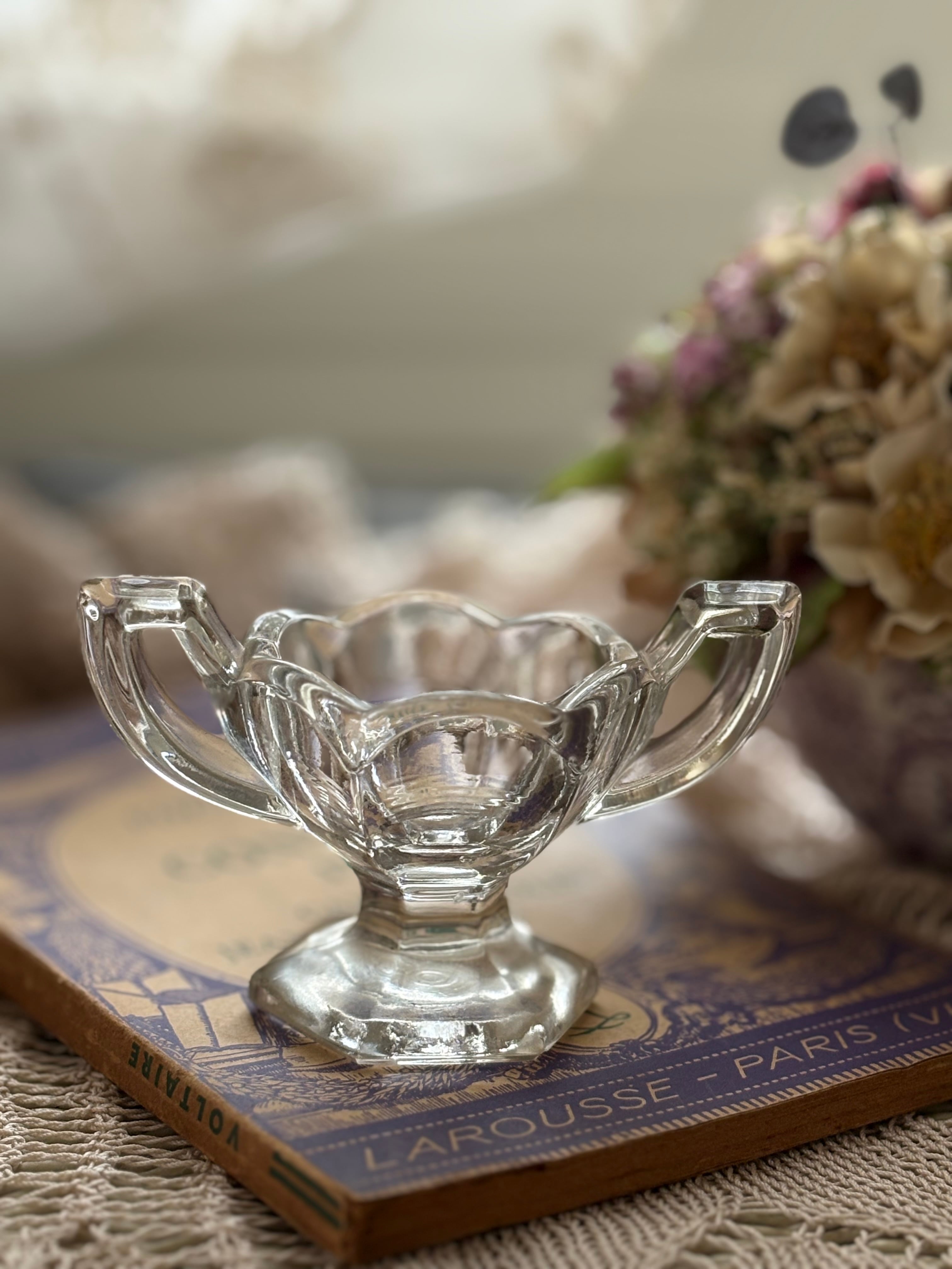 英国Vintage 小さなクリアガラスの脚付き・ハンドル付きスパイスディッシュ スパイスボウル ソルト&ペッパー 小物入れ フラワーベースイ ンテリア小物 撮影小物